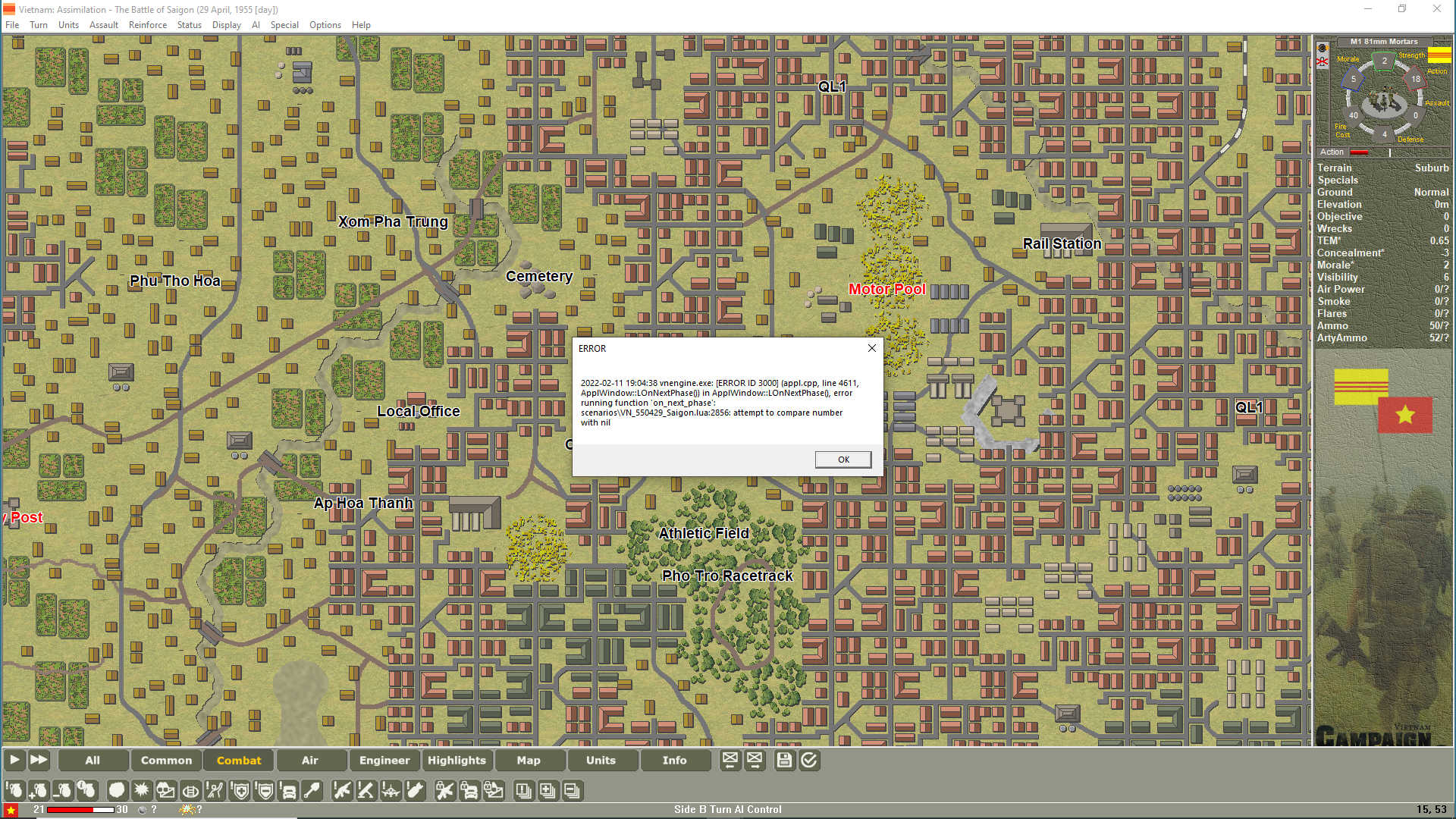 - At start, the units in (19,30) are surrounded by high walls and cannot move. True is that the engineering platoon in (20,30) can attempt to breach the wall, but it looks like an odd situation.