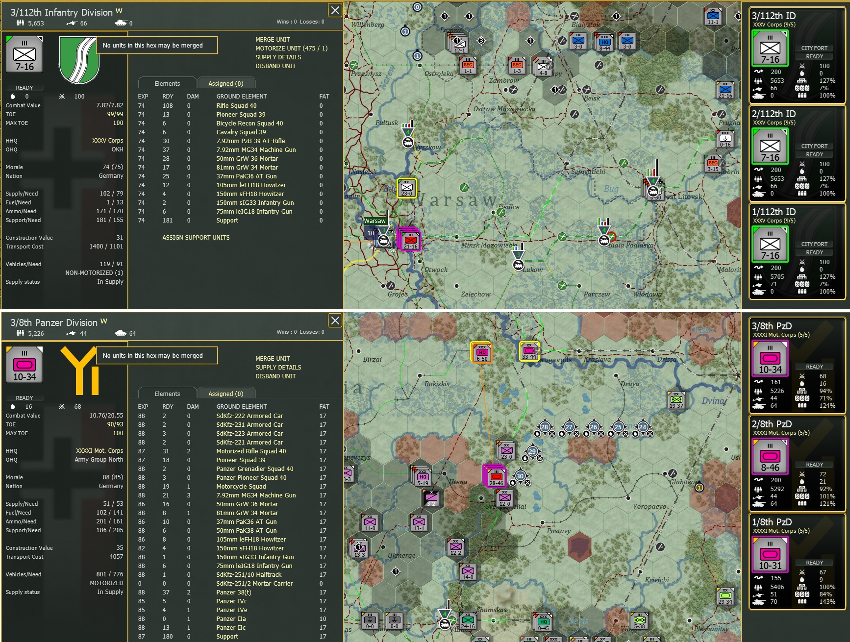 In 700 hours of play, I still haven't figured out how to merge units. I've tried many times, but always get notification: no unit in this hex may be merged always appears. In the test below, I tried to split and immediately merge the infantry division, which did not move and stands far from the enemy - failed. Then I tried to merge tank regiments from same division - it didn't work.