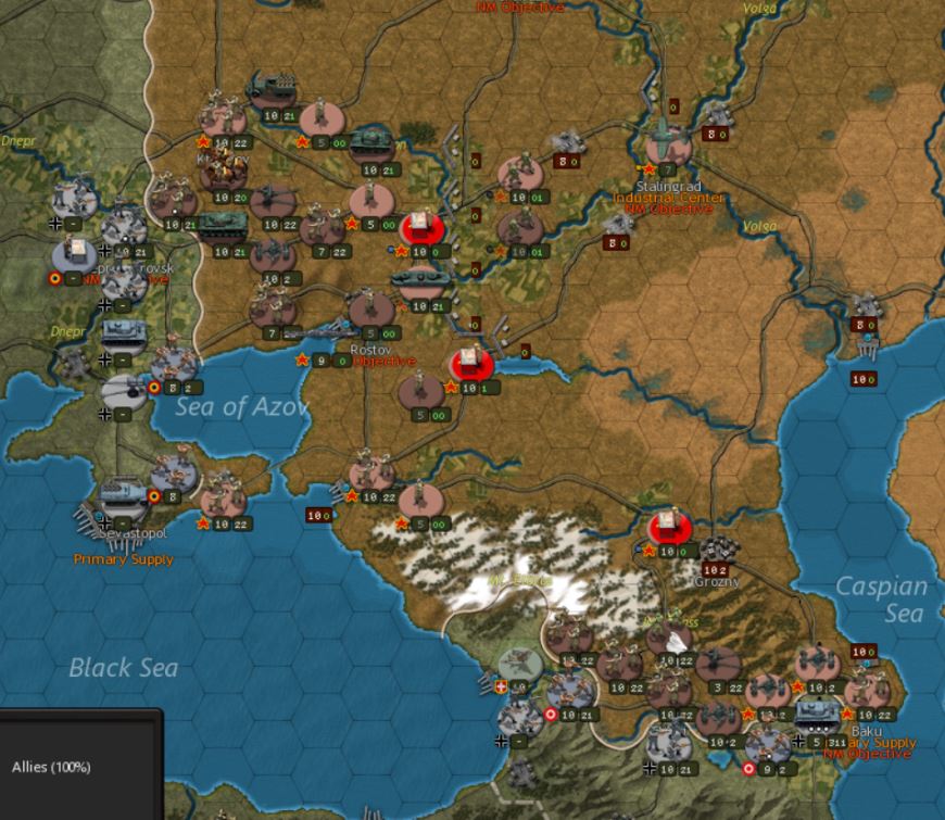 In Russia, winter was here, and the Russians could get a bit breathing room. For much of 42, the Russians stood firm without giving much ground, except 2 oil fields were lost to the Axis pushing from the Turkish side.