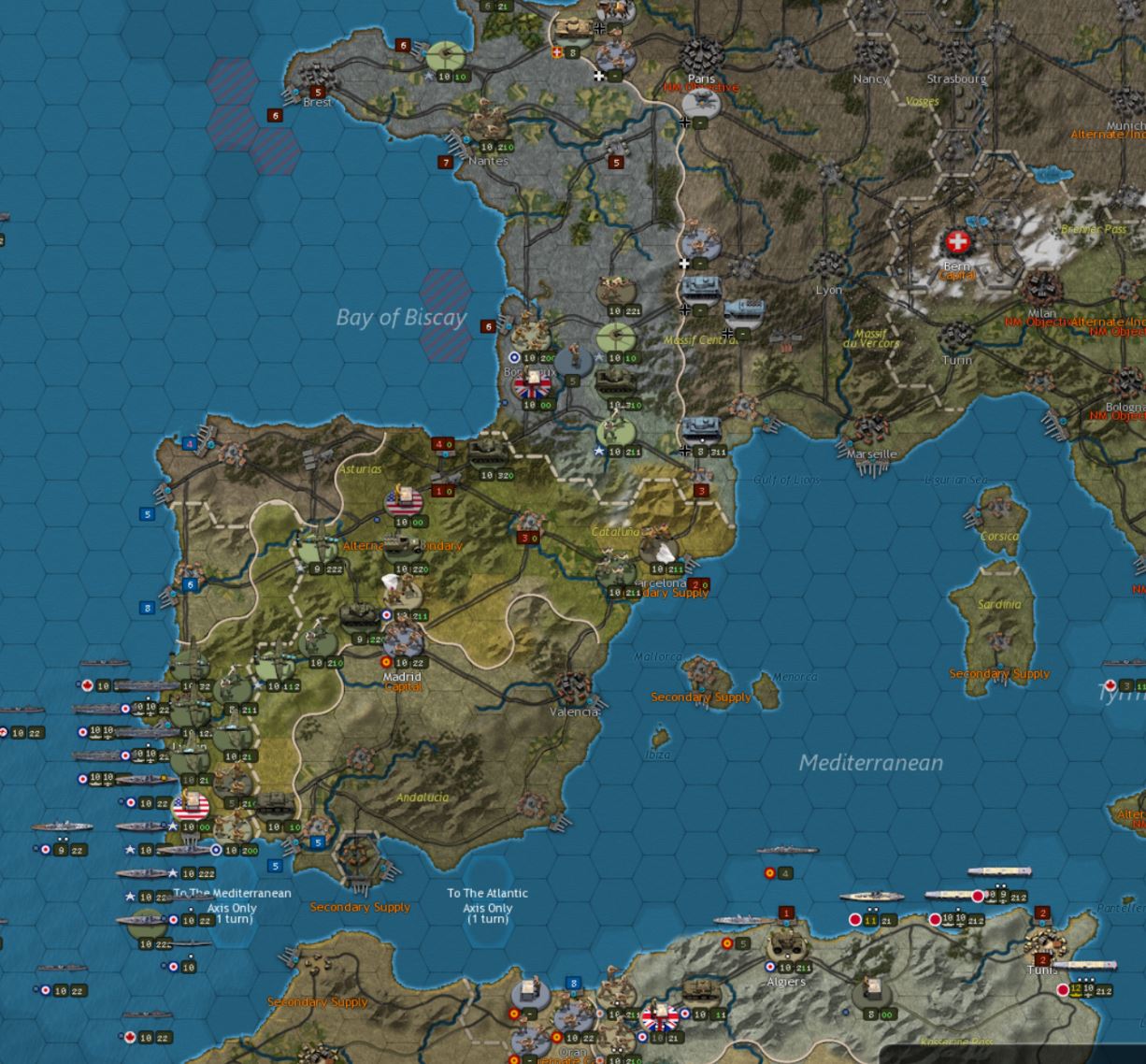 Allies pretty much all left W France, took Madrid and Gibraltar. Would the Americans be able to hold on to Spain, against the onslaught of all the Panzers and Tiger? I was pretty pessimistic at the time with that outlook.