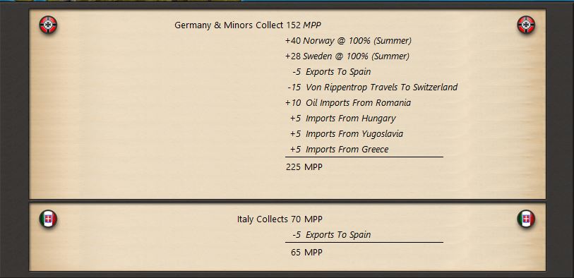 Via Decision Events I have decided to provide exports to Spain from both German and Italy to help sway Franco into the Axis camp. Spain begins the campaign at 10% Axis leaning (a 10% decrease from the default campaign). One of my main goals will be to entice Spain to join the Axis cause for the main purpose of capturing Gibraltar to close the Mediterranean after I capture Egypt. I have also brokered a deal with Switzerland to store our plundered gold reserves so that we can trade with some other neutral nations in the future (namely Switzerland herself and Portugal).