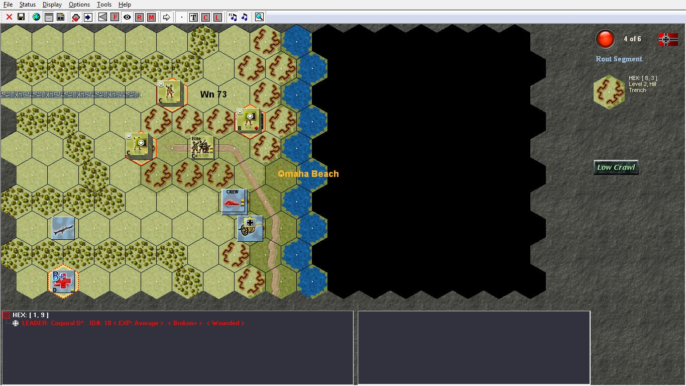 In the subsequent Rout segment, the stack (now reduced to a wounded leader) was highlighted to indicate it must rout, even though it should be sheltered by the scrub hexes [&:].