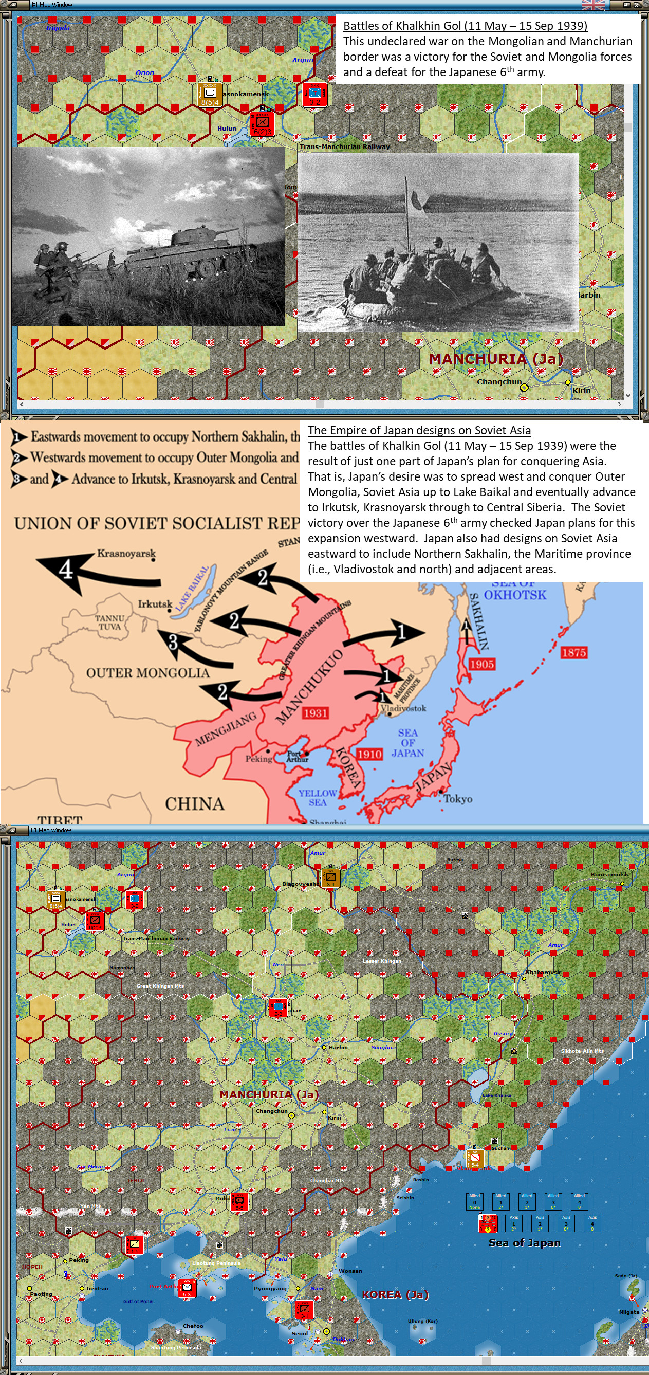 This is more than just tension. Two weeks after the official start of the second world war on September 1st, 1939, the Japanese and Soviets are ending an undeclared war on the Mongolian and Manchurian border that's be raging for four months. This conflict was known as the Battles of Khalkhin Gol and the Soviets stopped the Japanese cold by defeating the Japanese 6th army. The battles of Khalkhin Gol were a result of Japan's design of what appears to be all of Soviet Asia.