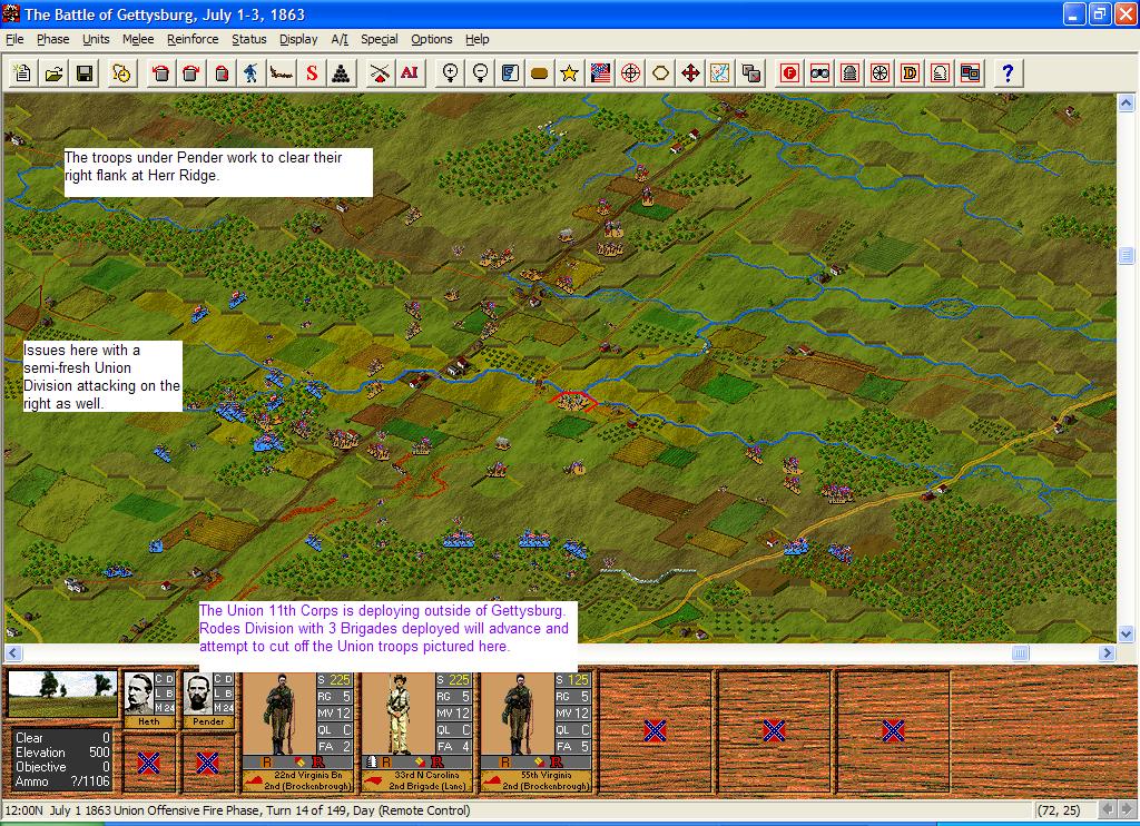 Here comes the rude surprise! As Heth and Pender maintain contact with the Union 1st Corps here comes Rodes on their flank!