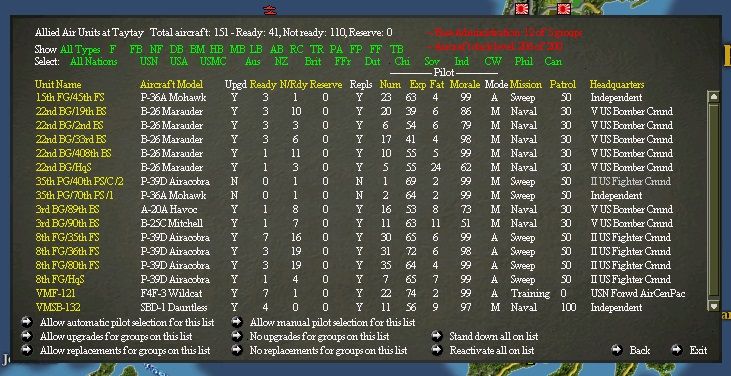 The P-40s and A-24 units show up early, but they have horrible training. You can remove the pilots from the units and substitute the best available from the reserve pool, but in general the USAAF has poor pilot quality in the early going.