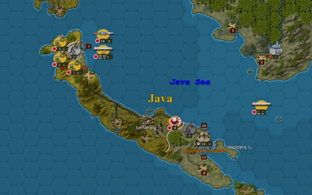Well he pulled up some Medium Tanks from somewhere and squashed the Burmese Regiment that attacked the engineer. I think my intercepts caused some aircraft damage, they took 2. Since the Singapore defenses fell, he slipped a sub past and parked a sub on the Burma convoy line and to slow down further reinforcement.