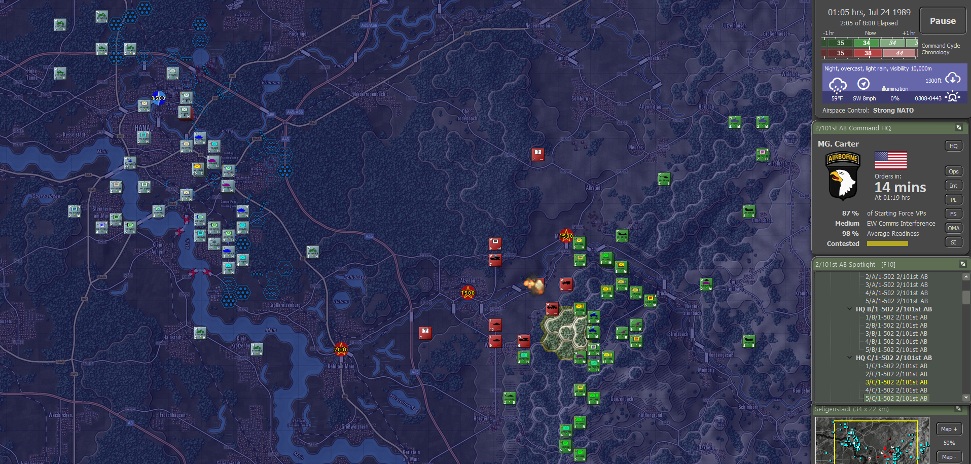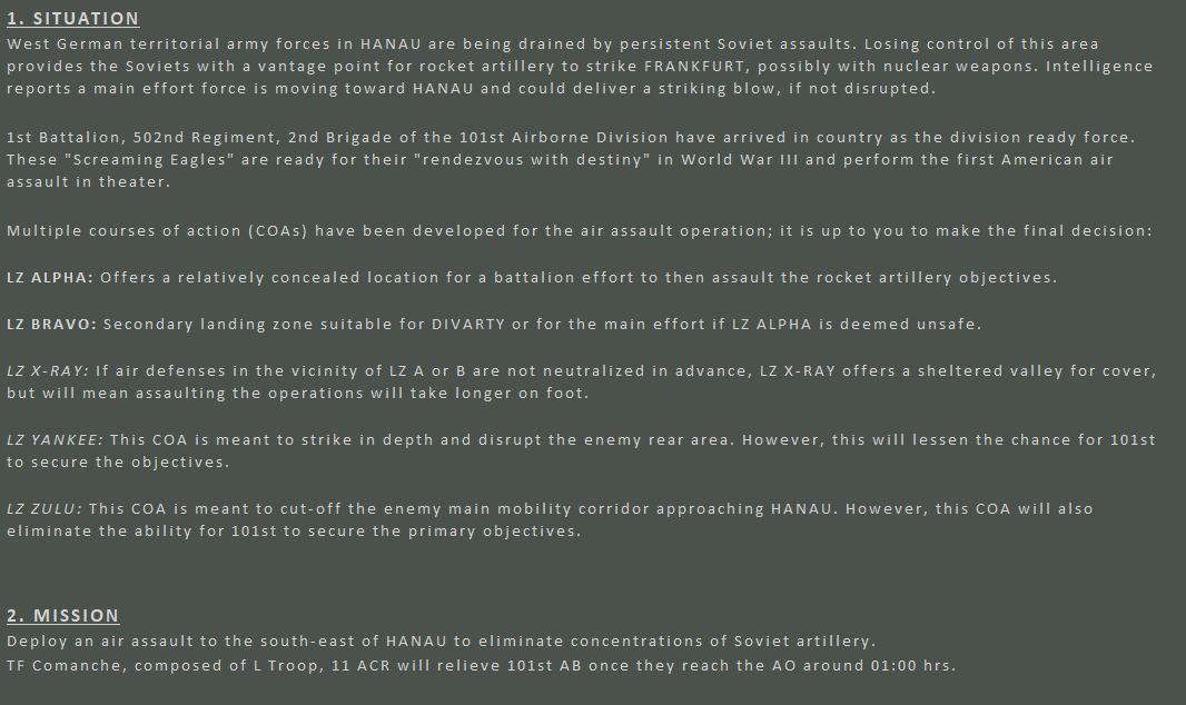 The 1st Battalion of the 502nd was advised of their first task as soon as the 101st unloaded; Soviet rocket batteries were deploying outside Hanau, too close to the Frankfurt HQ to be acceptable; it couldn't be allowed for them to be tempted to use tactical nukes on such a juicy target. The West Germans were desperately holding Hanau with 11 ACR sending a relief column ASAP. Looking at the remainder of the force dispositions... what the hell?