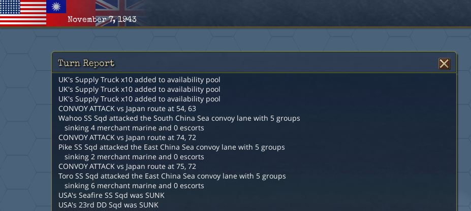 On the subwar front, Japanese is again losing MM this turn. They are now down to 141 MM. But, they have now 12 escort ships and I can assume more MM and escort ships are coming since the appearance of the first US subs.