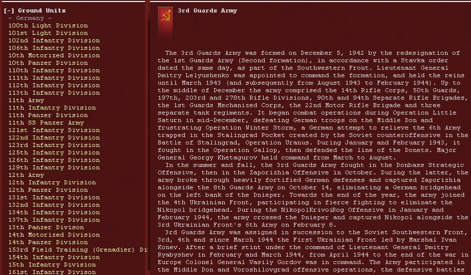 'W' takes you to a new screen. Red Lancer will cover this in one of his showcases but here's a wee peak, it gives you access to a nice historical write up of almost every major unit in the game: