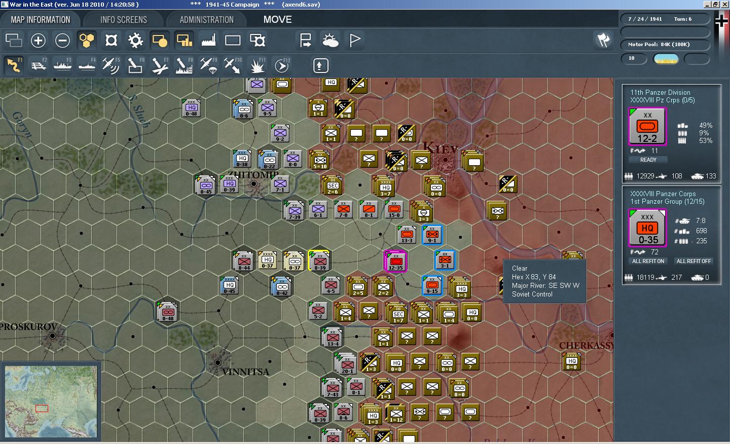 AGS: reasonable pocket formed south of Zhitomir some SU troops should escape as there is not a solid wall of units. Many testers change divisions into regiments to seal pockets, but I have found that the AI will pounce on regiments to crack open the pocket, so I tend to use divisions. Everything in this game is swings and roundabouts.