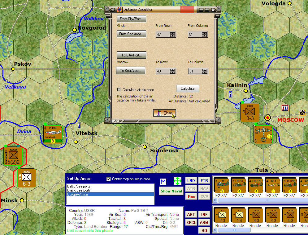 The top is the review units forms which has a lot of information about each unit. The one under the cursor is the IL-4 with a blow up of the high resolution bitmap image, a little panel listing all the numbers associated with the unit, a text description, a mini-map at the bottom showing where the unit is on the map, and any note that has been attached to the unit by the player (here that is blank). The Soviet flag in the upper right corner of the form indicates that this is the active form.