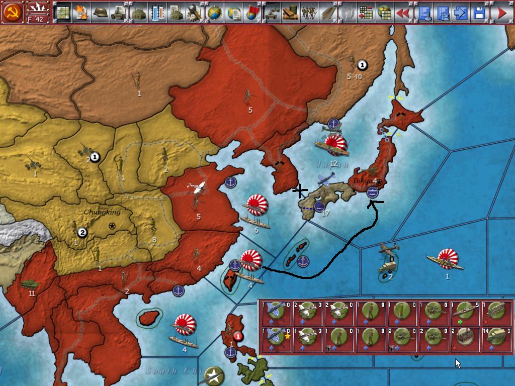 Japan: As soon as I ended my movement impulse last turn, I realized my mistake. Carriers were supposed to be on East side of Japan! Kudos to Ning for noticing and exploiting! Well, due to choke points and fighters etc, I was unable to move any transports back to where I could bring troops back. But, I doubt that I could have brought enough back to do the trick anyhow.... Japan will fall next turn. Would have been have been nice to show screen shot of the pop-up of 8-9 planes asking me if I still wished to move transport!!!