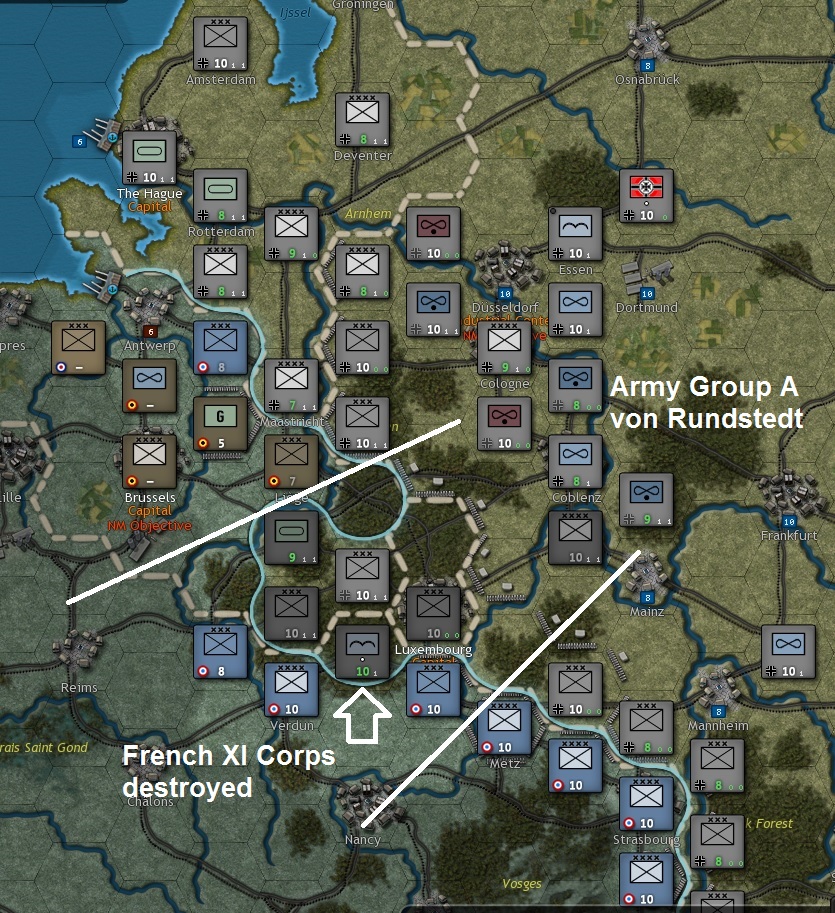 With the Aerial artillery failing, the panzers are needed to keep momentum going - rather than exploitation. Guderian and the infantry of Army Group A forge a bridgehead over the Meuse at Sedan, but Guderian's tanks are depleted in so doing. Reinhardt and his panzers are required to remove the obstacle that was the Belgian I Corps, thus opening up the front. Hoth cannot get into the action.